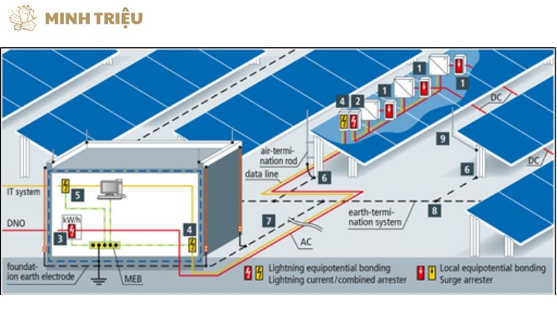 • Lưu ý về điện áp hoạt động và dòng xả của SPD DC: Việc chọn SPD DC với điện áp định mức (Uc) phù hợp với điện áp DC Bus là cực kỳ quan trọng. Dòng xả danh định (In) và dòng xả tối đa (Imax) của SPD phải đủ lớn để chịu được các xung sét dự kiến trong khu vực.