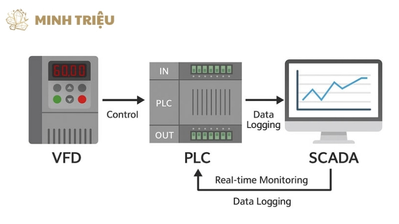 Khả năng kết nối và giao tiếp đa dạng là đặc điểm nổi bật của biến tần thông minh, chúng cho phép thiết bị trao đổi dữ liệu liền mạch với các hệ thống khác trong mạng lưới công nghiệp.