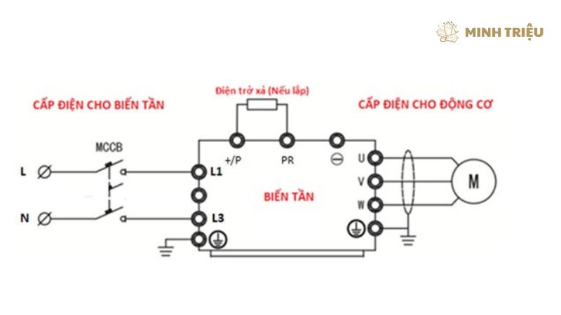 Sơ đồ đấu nối dây động lực là phần quan trọng nhất trong việc lắp đặt biến tần, đảm bảo dòng điện được truyền tải an toàn và hiệu quả từ nguồn đến biến tần và từ biến tần đến động cơ.