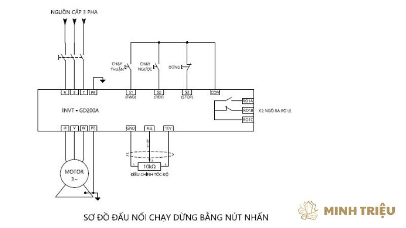 Sơ đồ đấu nối dây điều khiển thiết lập các kênh giao tiếp và điều khiển quan trọng giữa biến tần với các thiết bị ngoại vi, cho phép người dùng hoặc hệ thống tự động hóa điều khiển hoạt động của biến tần một cách linh hoạt và chính xác.
