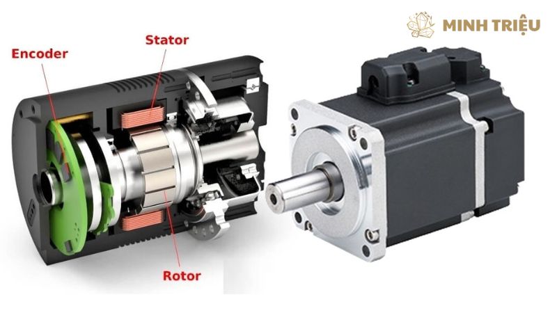 Cấu tạo động cơ servo bao gồm ba thành phần cơ bản và không thể tách rời, làm việc hài hòa để đảm bảo tính chính xác của hệ thống. Động cơ (motor) thực hiện chức năng sinh ra mô-men xoắn để tạo chuyển động cơ học. Bộ mã hóa (Encoder/Resolver) thực hiện chức năng đo lường chính xác vị trí, tốc độ của động cơ, sau đó chuyển đổi dữ liệu này thành tín hiệu điện tử phản hồi.