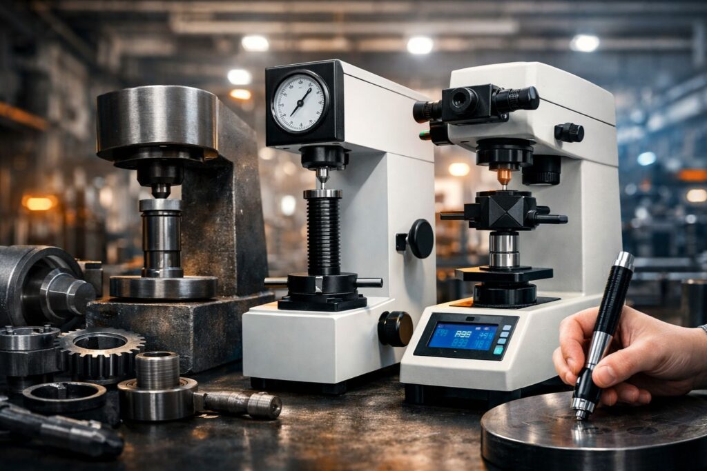 | Rockwell | HRC/HRB | Nón kim cương / Bi thép | Thép tôi, thép hợp kim | Nhanh, phổ biến trong sản xuất |