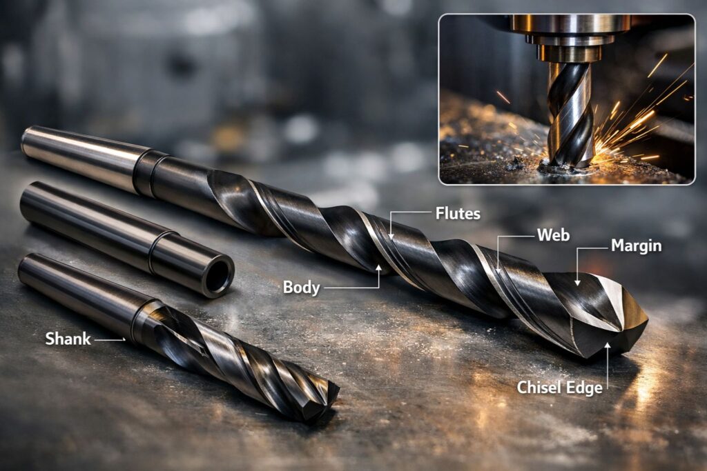 2. Sơ đồ cấu tạo chi tiết của một mũi khoan xoắn tiêu chuẩn (Twist Drill)