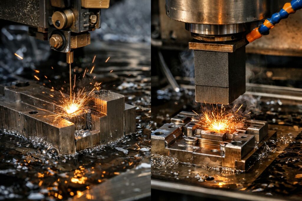 Khác với phay hay tiện, EDM không cần dao cụ cứng hơn vật liệu gia công. Thay vào đó, nó dùng điện cực (đồng hoặc dây cắt) và dung môi cách điện để “ăn mòn” kim loại theo định hình mong muốn.