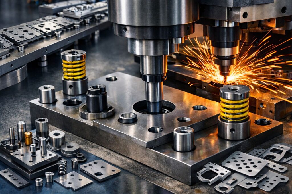- Cối (Die): Có biên dạng khớp hoàn hảo với chày. Khoảng hở giữa chày và cối là yếu tố kỹ thuật then chốt quyết định chất lượng vết cắt.