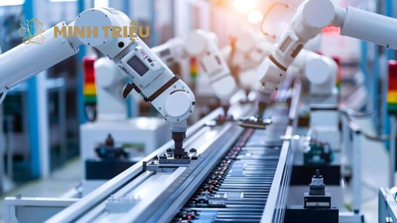 - Robot cộng tác (Cobots) và Robot Gắp/Đặt: Băng tải Pallet cung cấp một nền tảng ổn định và định vị chính xác để robot có thể thực hiện các thao tác gắp/đặt linh kiện siêu nhỏ hoặc lắp ráp cụm bán tự động. Việc băng tải định vị pallet với độ chính xác cao giúp robot có thể hoạt động mà không cần hệ thống thị giác phức tạp, tăng tốc độ và độ tin cậy.