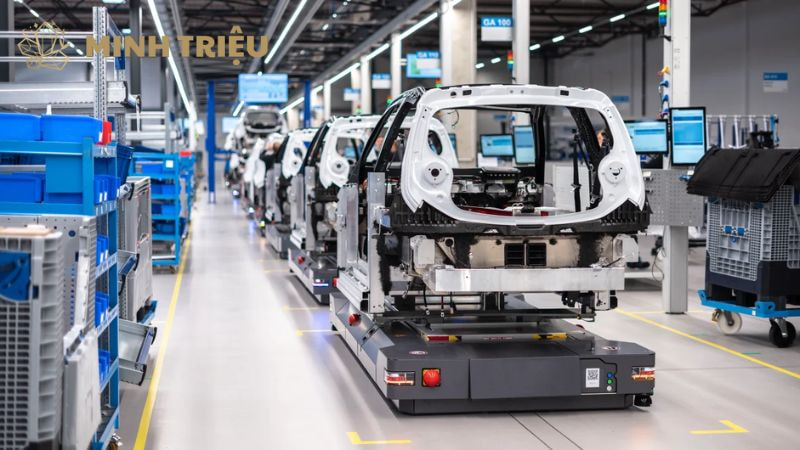 • Sự chuyển dịch Công nghệ: Các nhà máy ô tô đang dần thay thế một phần băng tải cố định bằng Xe Tự hành Có Hướng dẫn (Automated Guided Vehicles – AGVs) hoặc Xe Tự hành bằng Robot (Robotic Guided Vehicles – RGVs).