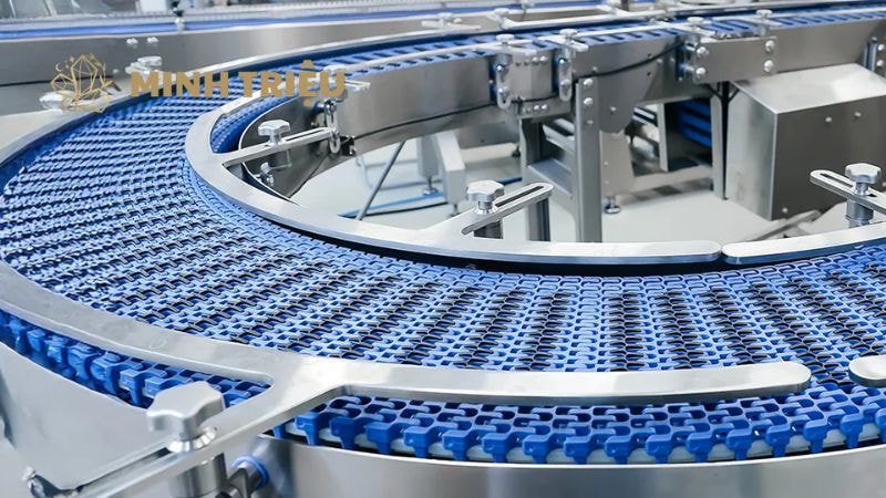 - Đặc điểm: Sử dụng các mắt xích kim loại hoặc nhựa mô-đun (Modular Plastic Chain) làm mặt tải. Có khả năng chịu tải rất nặng, chịu nhiệt độ cao và ít bị ảnh hưởng bởi dầu mỡ.