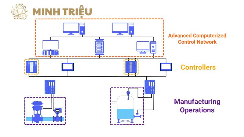- Cấp độ 2: Cấp điều khiển quy trình (Process Control Level): Đây là “bộ não” của hệ thống, nơi các thuật toán điều khiển được xử lý và thực thi. Cấp độ này nhận dữ liệu từ cấp hiện trường và đưa ra các quyết định điều khiển.
