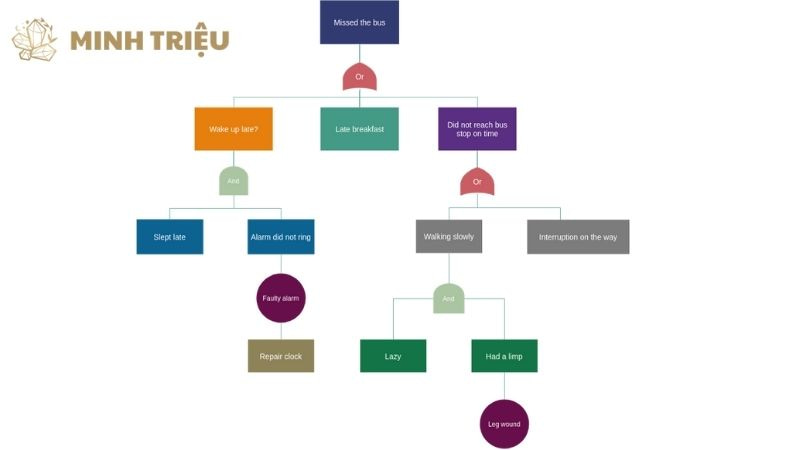 FTA là một phương pháp phân tích từ trên xuống, bắt đầu từ một sự cố không mong muốn (top event) và sử dụng logic Boolean để xác định tất cả các nguyên nhân gốc rễ có thể dẫn đến sự cố đó. Phương pháp này rất hiệu quả trong việc tìm ra các điểm yếu của hệ thống và lỗi hệ thống tiềm ẩn. Ví dụ về một cây lỗi đơn giản: