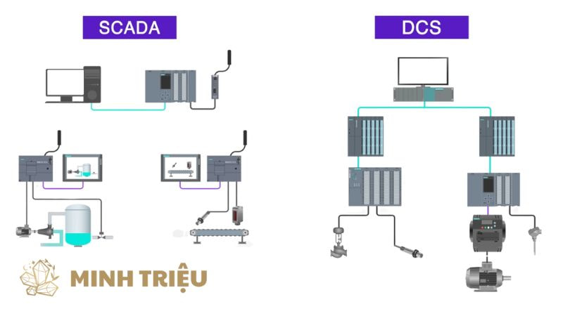 Kiến trúc | Phân tán, mạnh mẽ, có khả năng dự phòng | Tập trung, từng bộ điều khiển độc lập | Kết nối rộng, bao gồm nhiều PLC và RTU |