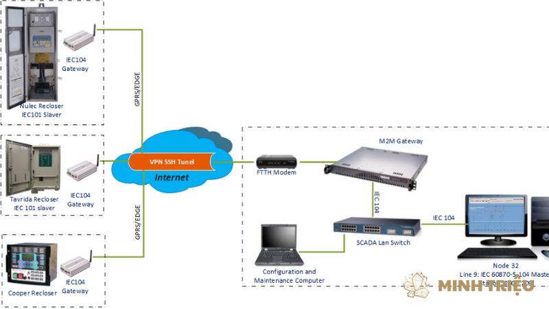 Vậy, SCADA không dây là gì và tại sao lại cần thiết trong bối cảnh công nghiệp hiện đại? SCADA không dây là việc thay thế các đường truyền hữu tuyến bằng các công nghệ mạng không dây để thu thập dữ liệu và gửi lệnh điều khiển. Hệ thống này bao gồm các thiết bị đầu cuối không dây như cảm biến và bộ điều khiển, các bộ thu phát (transceiver) để truyền và nhận tín hiệu, và phần mềm SCADA tương thích có khả năng xử lý dữ liệu không dây. Thay vì phải đi hàng kilomet dây cáp, các thiết bị này giao tiếp với nhau qua sóng vô tuyến.
