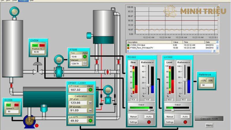 PLC sẽ so sánh mức thực tế với mức đặt do HMI của SCADA cung cấp. Dựa trên sai số, PLC sẽ gửi tín hiệu đến thiết bị chấp hành, có thể là một máy bơm để bơm thêm chất lỏng vào hoặc một van để xả bớt. Nhờ cơ chế tự động này, người vận hành không cần phải thường xuyên kiểm tra và điều chỉnh bằng tay, giảm thiểu rủi ro tràn bể hoặc thiếu nguyên liệu.