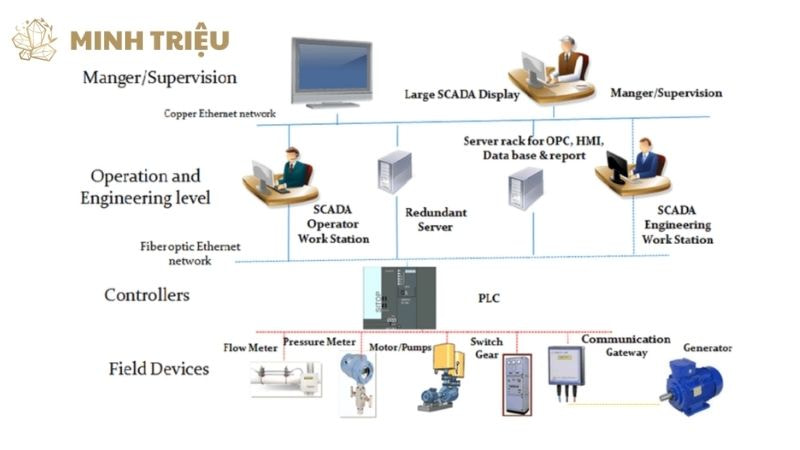 Cấp độ giám sát và điều khiển là “bộ não” của hệ thống SCADA. Nơi đây, dữ liệu từ PLC và RTU được tổng hợp, xử lý và hiển thị cho người vận hành. Thành phần chính bao gồm máy chủ trung tâm, phần mềm SCADA và giao diện người-máy (HMI).