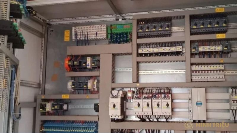 Trung tâm của tủ chính là PLC và các module I/O. Chúng được gắn trên thanh ray DIN và được đặt ở vị trí dễ tiếp cận nhất. Bộ nguồn được đặt gần PLC để đảm bảo việc cung cấp điện áp ổn định và an toàn. Các bộ chuyển đổi tín hiệu và bộ điều khiển như biến tần thường được đặt ở khu vực riêng biệt, được cách ly với các tín hiệu nhạy cảm để tránh nhiễu điện từ.