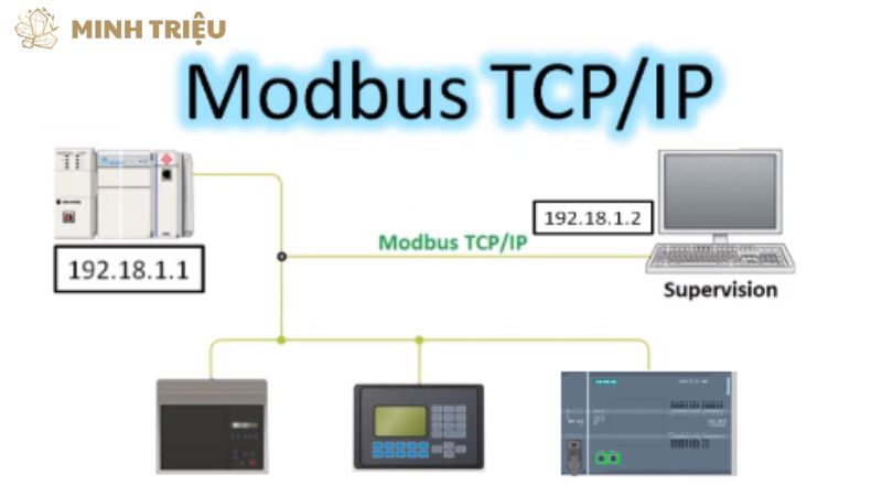 Modbus TCP/IP là phiên bản Modbus chạy trên nền tảng Ethernet TCP/IP tận dụng lợi thế của mạng Ethernet hiện đại. Cơ chế hoạt động của nó dựa trên mô hình Client (HMI) gửi yêu cầu và Server (Biến tần) phản hồi qua mạng Ethernet, sử dụng cổng port 502 làm cổng mặc định.
