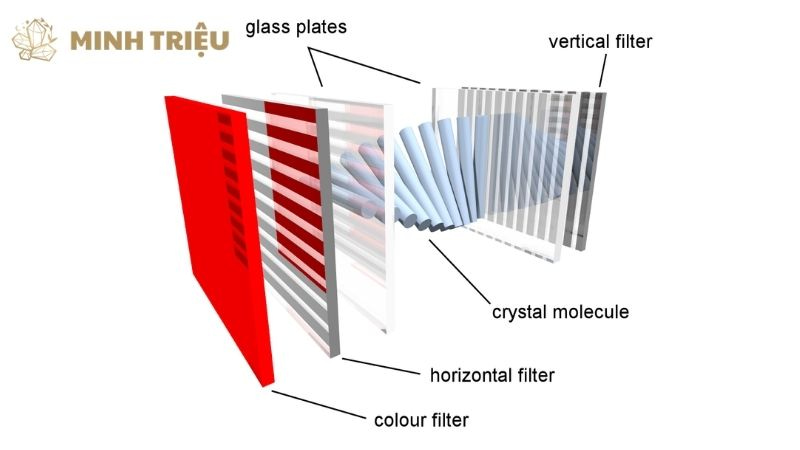 Bộ lọc phân cực (Polarizer) bao gồm hai tấm lọc phân cực đặt ở phía trước và phía sau lớp tinh thể lỏng, chúng chỉ cho phép ánh sáng có hướng phân cực nhất định đi qua. Lớp tinh thể lỏng (Liquid Crystal Layer) là lớp mỏng chứa các tinh thể lỏng nằm giữa hai tấm kính có điện cực, nó có chức năng xoay hoặc thẳng hàng dưới tác động của điện trường để điều khiển lượng ánh sáng đi qua.