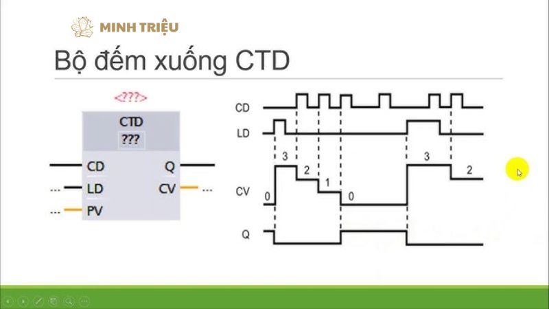 Lệnh CTD là một khối chức năng PLC dùng để đếm các sự kiện theo chiều giảm, tức là giá trị hiện tại (CV) của bộ đếm sẽ giảm đi một đơn vị mỗi khi có một xung kích hoạt tại đầu vào đếm. Khi tín hiệu tại chân CD (Count Down input) chuyển trạng thái từ OFF sang ON (cạnh lên), giá trị đếm hiện tại (CV – Current Value) sẽ giảm đi 1. Lệnh CTD cũng có một chân LD (Load input), khi được kích hoạt, nó sẽ nạp giá trị đặt trước (PV) vào CV, chuẩn bị cho quá trình đếm ngược.
