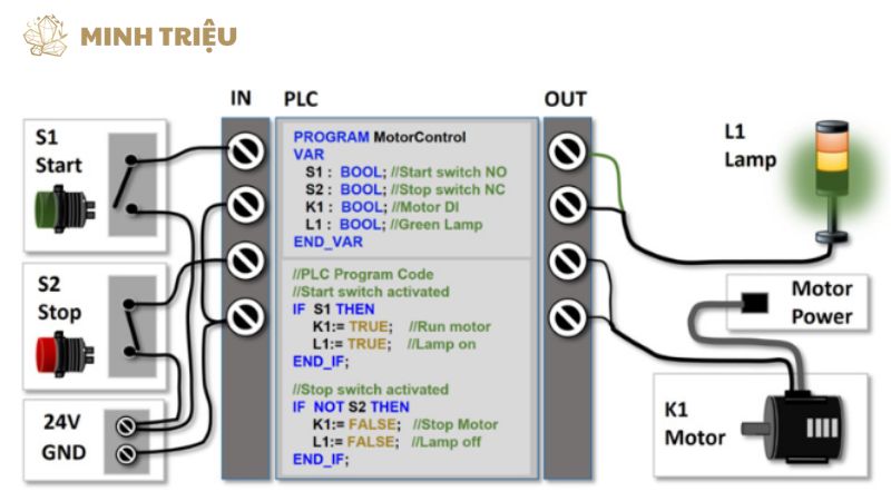 Trong mỗi chu kỳ quét, PLC sẽ đọc tất cả các đầu vào vật lý, sau đó thực thi toàn bộ chương trình ST từ dòng đầu tiên đến dòng cuối cùng. Sau khi chương trình được thực thi xong, PLC sẽ cập nhật trạng thái của tất cả các đầu ra vật lý dựa trên kết quả tính toán.