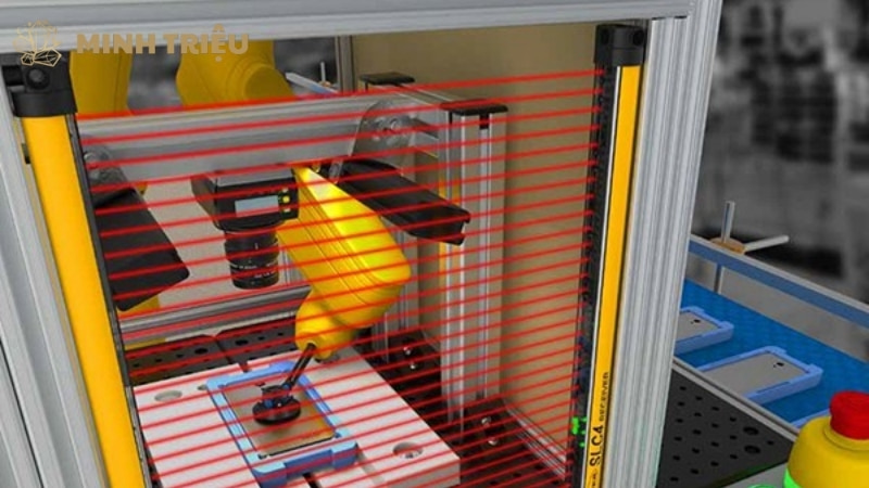 • Dừng được giám sát an toàn (Safety-rated Monitored Stop – SMS): Phương thức này định nghĩa rằng robot sẽ dừng hoạt động an toàn ngay lập tức khi hệ thống phát hiện con người đi vào không gian làm việc được giám sát của nó. Đặc điểm nổi bật là yêu cầu các cảm biến an toàn như máy quét laser hoặc rèm ánh sáng và hệ thống giám sát để kích hoạt dừng khẩn cấp. Ứng dụng phổ biến bao gồm tải/dỡ phôi cho máy móc hoặc các quy trình kiểm tra chất lượng đơn giản, nơi con người chỉ cần can thiệp khi robot dừng hoàn toàn.