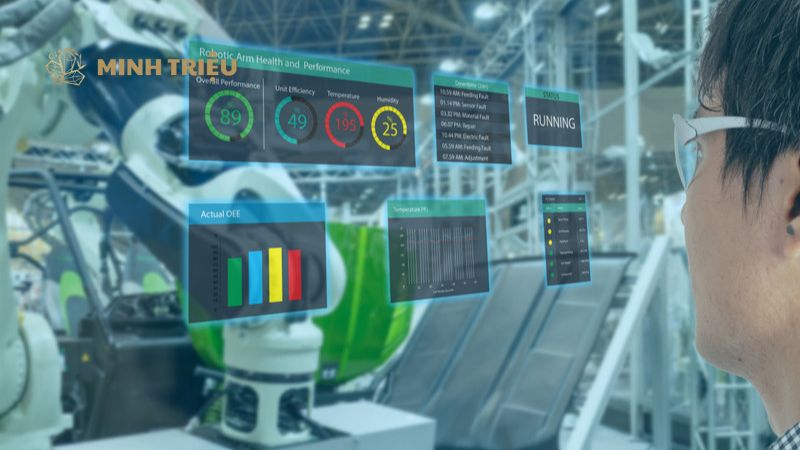- Hiển thị dữ liệu thời gian thực và trạng thái hoạt động: Với AR, các thông số hoạt động của cobot như tốc độ, lực, trạng thái cảm biến, hoặc các cảnh báo lỗi có thể được hiển thị trực tiếp trên màn hình thiết bị AR của người vận hành, ngay tại khu vực làm việc của cobot. Khi có sự cố, hệ thống có thể hiển thị hướng dẫn khắc phục sự cố ngay tại chỗ, chỉ rõ vị trí cần kiểm tra hoặc điều chỉnh. Điều này giúp giám sát và điều chỉnh hoạt động của cobot một cách trực quan và tức thời.