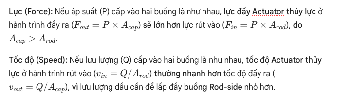 Sự khác biệt về lực và tốc độ hành trình trong Actuator thủy lực tác động kép bắt nguồn từ sự chênh lệch diện tích piston hiệu dụng giữa hai buồng. Buồng Rod-side có diện tích tác dụng nhỏ hơn buồng Cap-side do sự hiện diện của thanh piston. Điều này dẫn đến hai hệ quả vật lý quan trọng:
