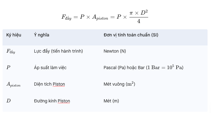 Công thức tính toán lực đẩy xác định lực bằng áp suất nhân với diện tích hình tròn của Piston.