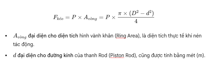Công thức tính toán lực kéo khẳng định lực bằng áp suất nhân với diện tích hình vành khăn, tức là diện tích Piston trừ đi diện tích thanh Rod.